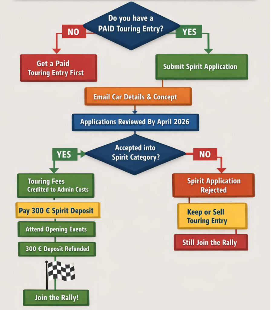 - You must have a valid paid TOURING CATEGORY entry. If for some reason your SPIRIT application is rejected you will not miss the rally. (Follow the instructions on our ENTER page)
